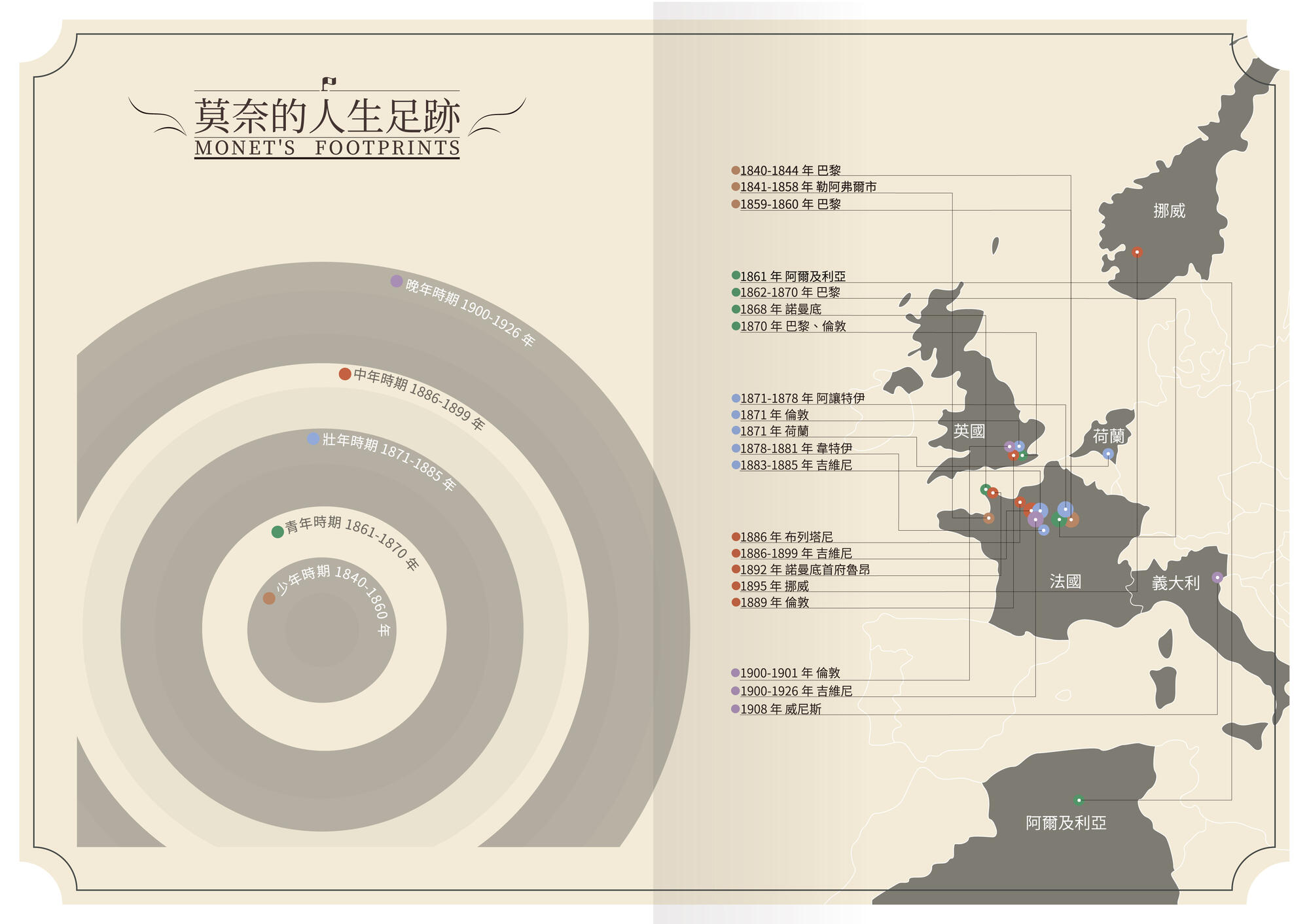 內文包含莫奈的人生足跡地圖和莫奈本人與藝術家前輩後輩的朋友圈。5個人生階段解析莫奈的代表作,呈現120幅品質大圖,搭配100張9色色譜。莫奈本人自述藝術創作生涯,19-20世紀藝術評論大師對其多個時期代表作的劃時代點評。