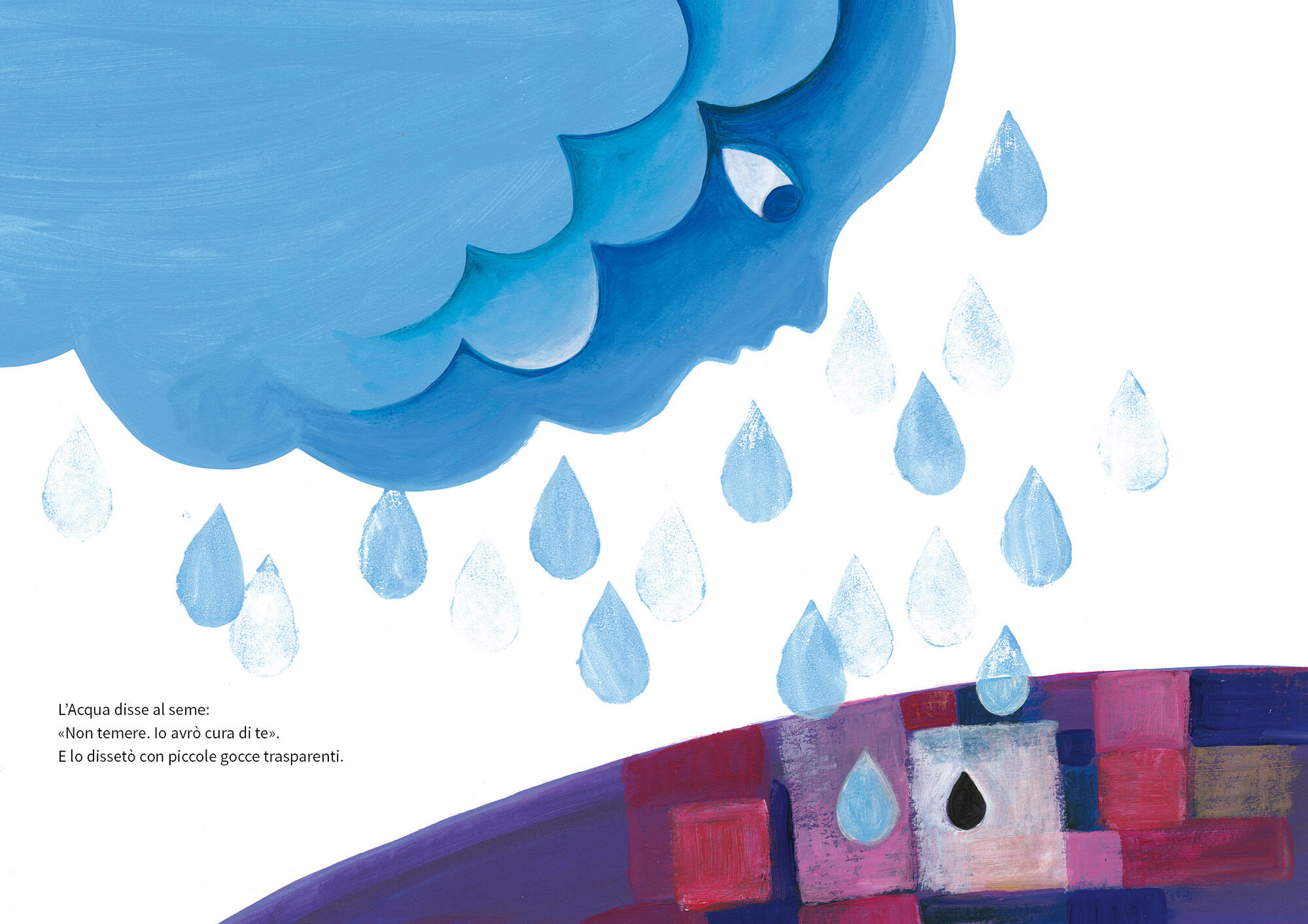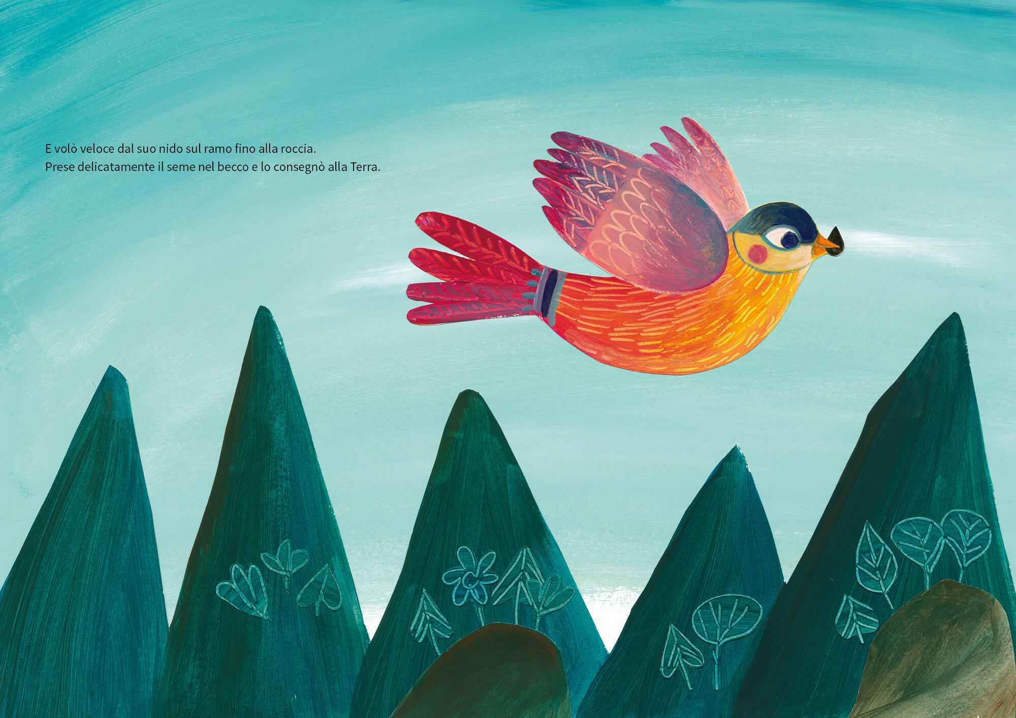 有一颗小小的种子,它是如此渺小,在这浩瀚的世界中感到迷失。天空,水和地球看到了它,觉得它很可爱。“别担心。我会好好照顾你的”,他们这么对种子说…… 很快地,小小的种子变成了一棵树,长得又大又强壮。 一只迷路的鸟正在寻找筑巢的地方。一天,小鸟从一棵树上摘下了一颗落在石头中的种子:她照料着它,将它交给了大地…
