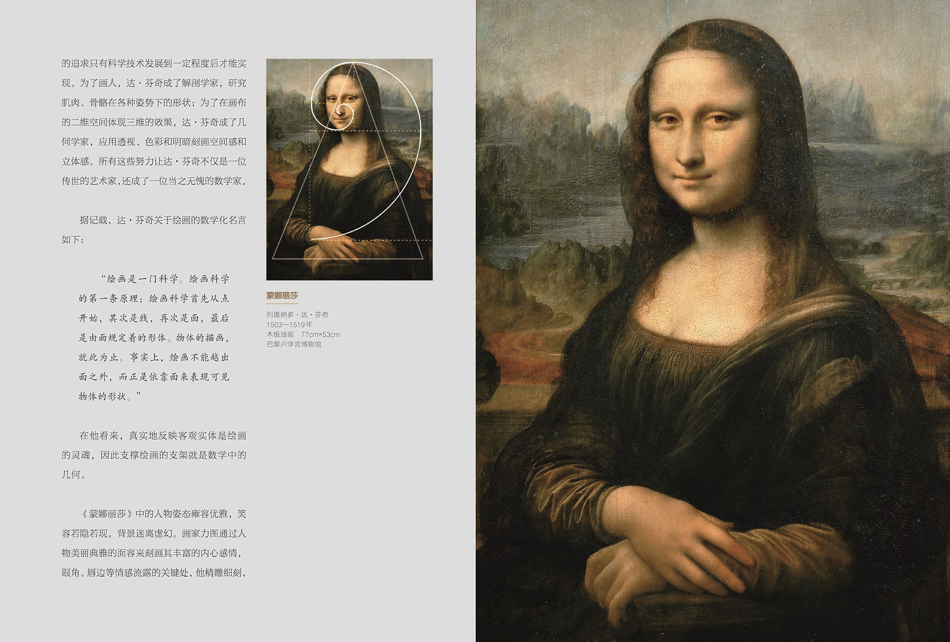 3.新穎的解讀視角,從數學的角度看藝術 “黃金分割比”是達·芬奇的《維特魯威人》看起來完美無瑕的關鍵,莫奈的《睡蓮》是“函數映射”在自然界中的體現,而倫勃朗筆下的群像呼應著“正態分佈”,濕婆雕像頭上的火焰狀裝飾物正在表現分形……