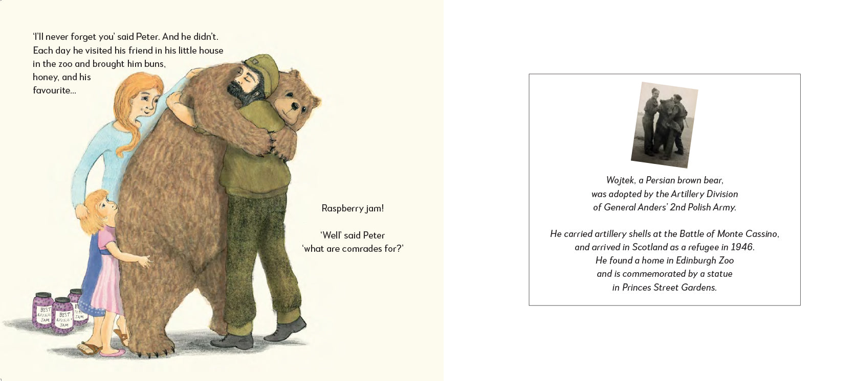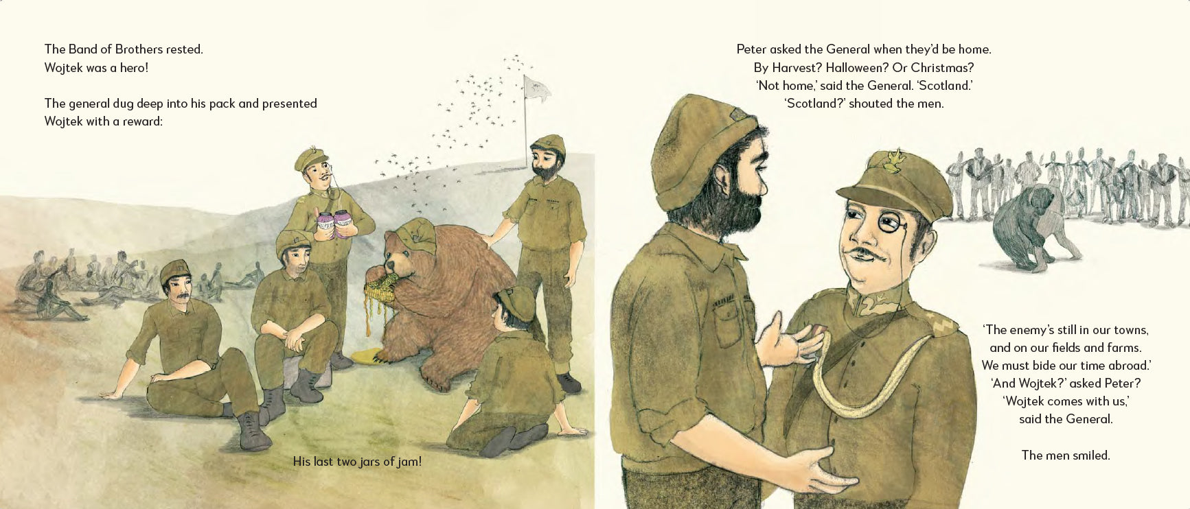 这本图画书是根据 1944 年 5 月参加卡西诺战役的波兰年轻士兵收养的一头幼熊的真实故事改编的。Wojtek在意大利战役中成为士兵的同伴,在他们让他成为军官后,在战斗中与他们并肩作战,最终与他们一起移民到苏格兰,当时所有人都在战争结束时失去了国籍。这是一个在毫无意义的恐怖战争中关于忠诚、友谊、家庭和流离失所的故事。