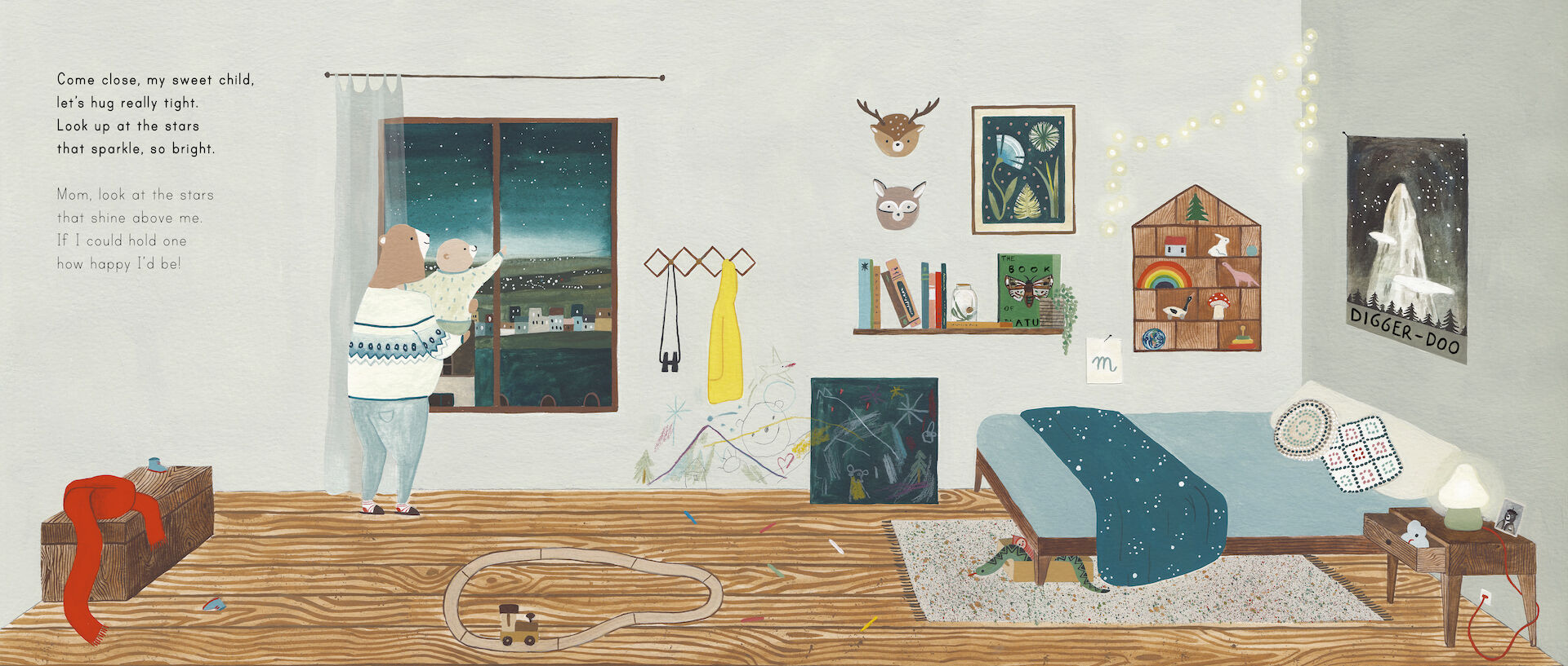 熊妈妈和她的孩子离开家去寻找星星,他们穿过黑暗的树林,穿过波涛汹涌的大海,穿过冰雪达到Digger-Doo山顶,但他们发现星星遥不可及,接下来会发生什么呢?