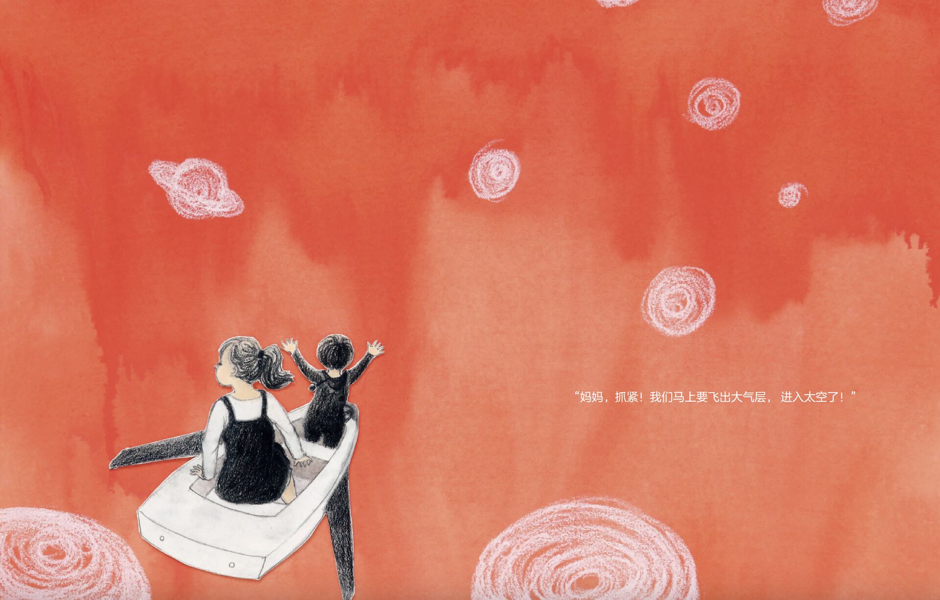 宇宙究竟是什麼樣子?沒有確切的答案,因為至今,人類的旅程還未飛出太陽系。大寫意的水彩底色逐頁加深,肌理層次也越來越複雜厚重,象徵著媽媽和孩子在向宇宙的深處探索;用白色油畫棒,畫出孩子塗鴉般的星雲; 人物和家庭場景用了剪貼的方式,讓真實和夢幻自然地疏離。