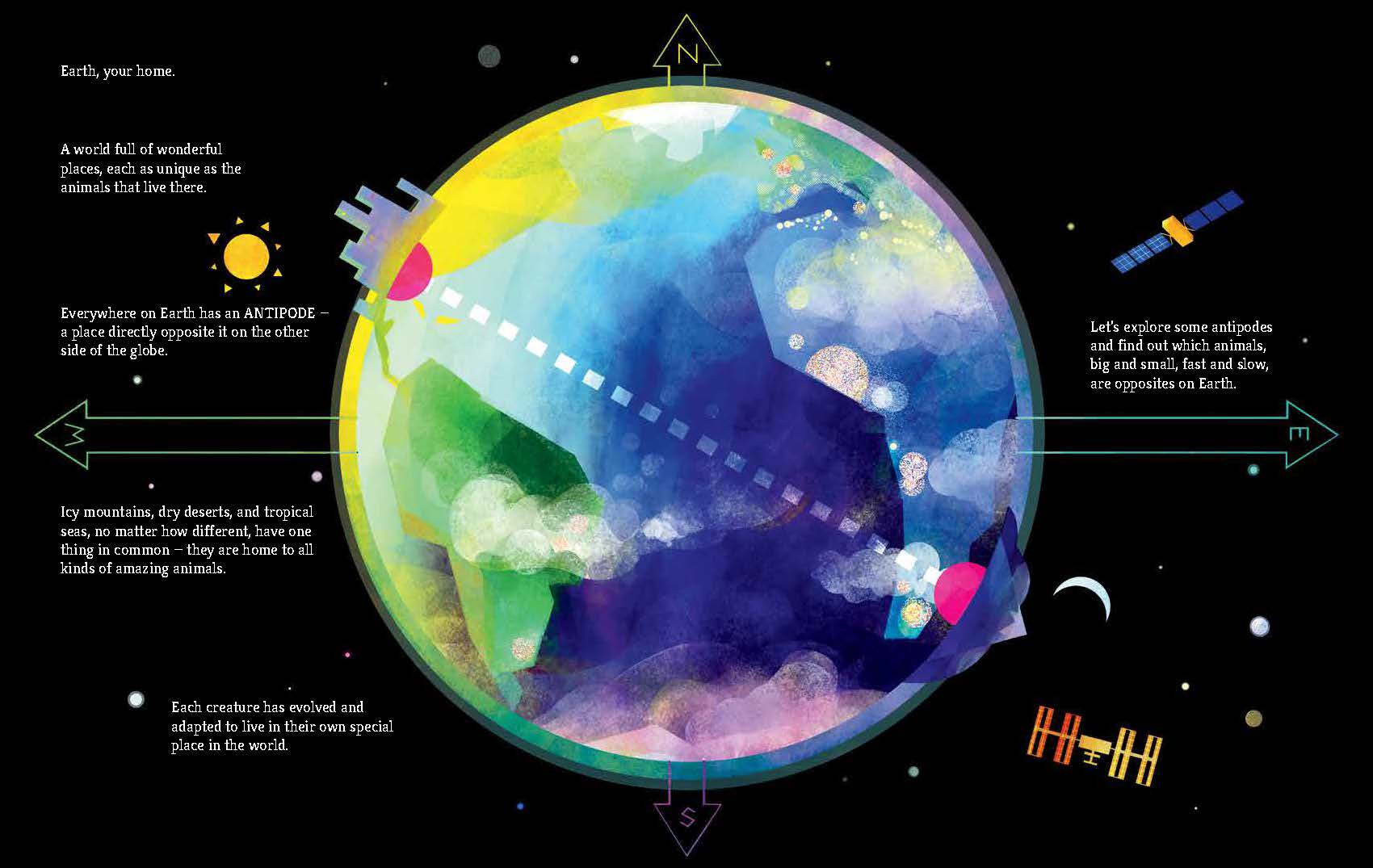 “对极点是地球上的对立点,本书通过生活在那里的动物的视角来介绍它们。每个跨页都有一组新的对极点,读者必须将书倒过来才能阅读另一面的内容,所以我们在一个跨页中从北极到南极,在另一个跨页中从印度的沙漠国家公园到复活节岛, 等等。每个位置都带有一两句关于生活在那里的动物的话,并且在每个传播的中间都有一张地球的小地图,以帮助读者知道方向。插图色彩丰富,内容丰富。它们以霓虹色和几何形状为特色,使学习页面上的事实变得自然而有趣。除了所有的 antipodes 传播之外,还有一些跨页讨论了诸如地球为何以这种方式旋转,以及读者如何找到自己的 antipodes(剧透警报:它可能在海洋中!)。封底的纸上印有书中的所有动物及其拉丁名称,看起来像方格纸,插图是用彩色铅笔和墨水完成的,看起来像是一本手绘动物日记。“——Let’s Talk Picture Books