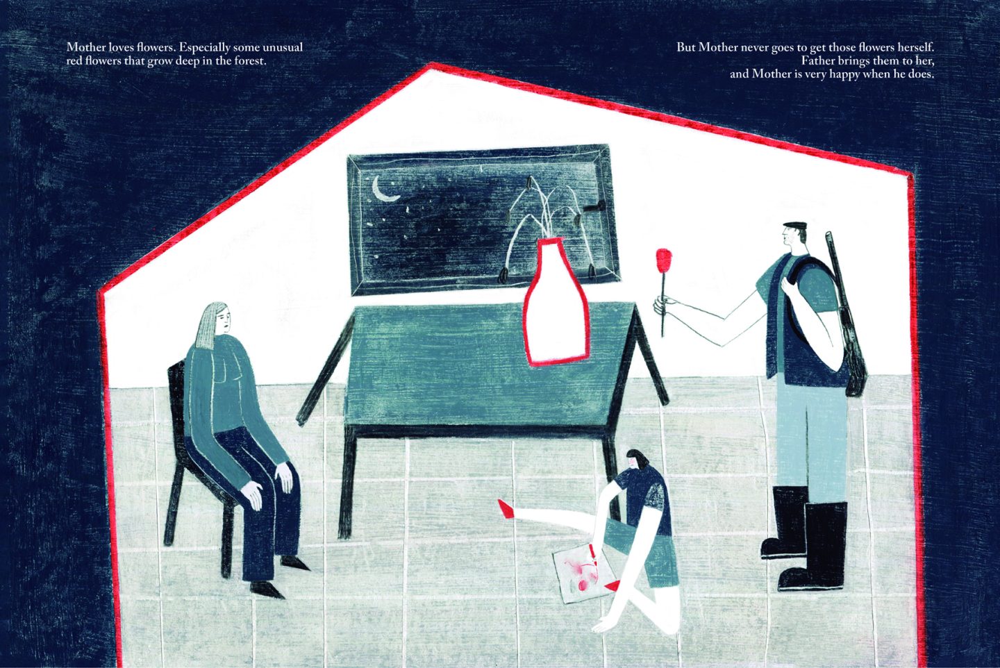 妈妈喜欢花,特别是不常见的开在森林深处的红色的花。但是妈妈从来不会自己去寻找这些花,都是爸爸带来给她的。每当爸爸给她带来一朵花,她都会很开心。她会给爸爸一个早安吻,做蛋糕给奶奶吃,抽时间跟我玩。但是当花凋谢了,妈妈也像凋谢了一样,她会把花倒挂起来,直到花朵变干,我们家就像一个花朵的坟场一样。