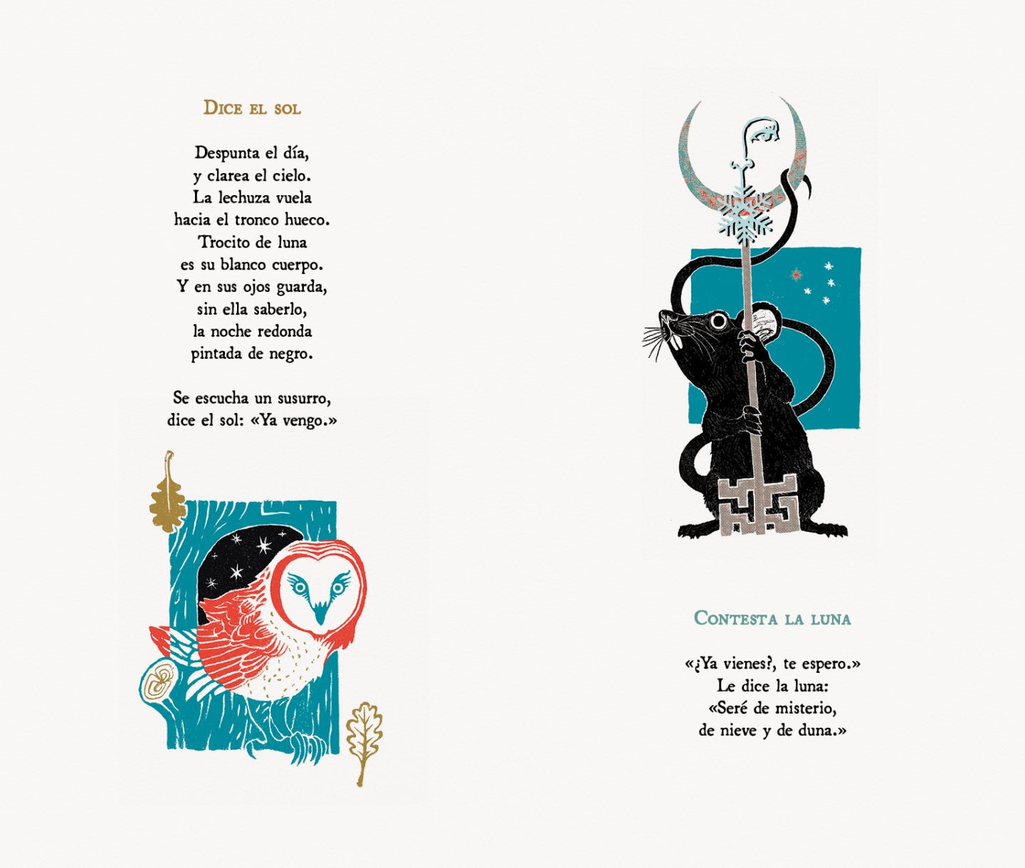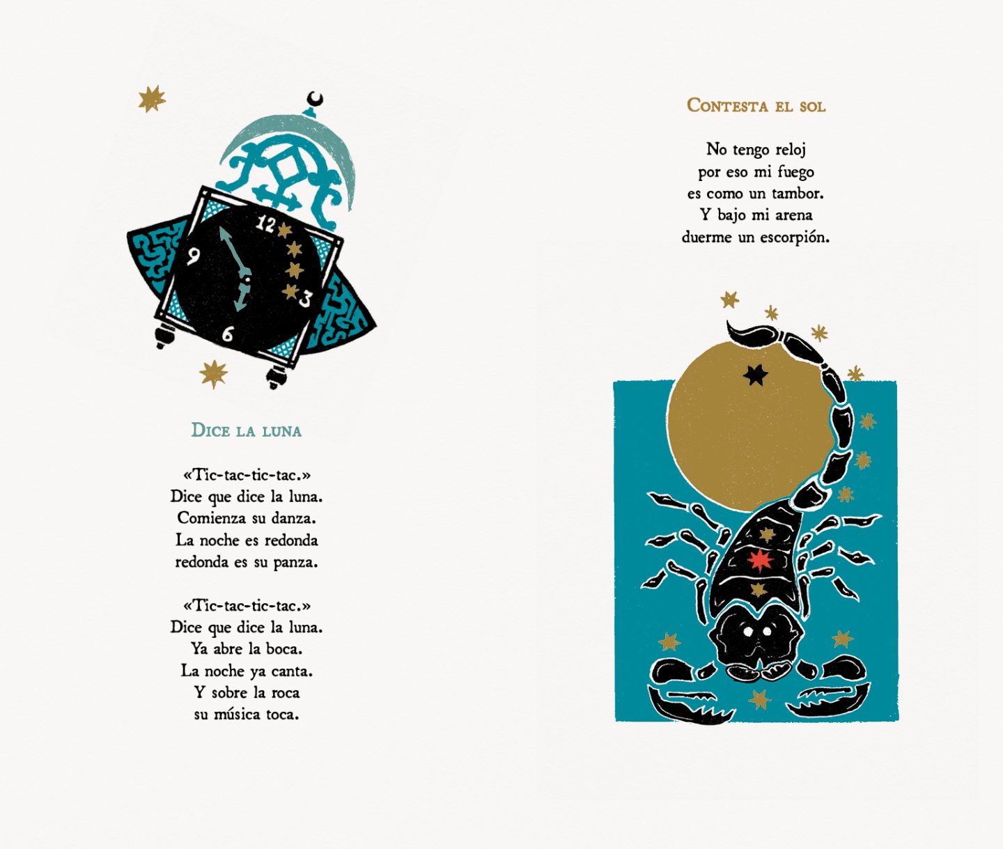在这本由马尔·贝内加斯(Mar Benegas)和布兰科·潘托哈(Blanco Pantoja)合作的新诗歌绘本中,太阳和月亮进行对话,告诉我们他们所看到的,同时也在进行着永恒的对立与联合的游戏。这部诗集展示了他们在一天中某些时刻相互远离或接近的方式,有时是光明,有时是黑暗。