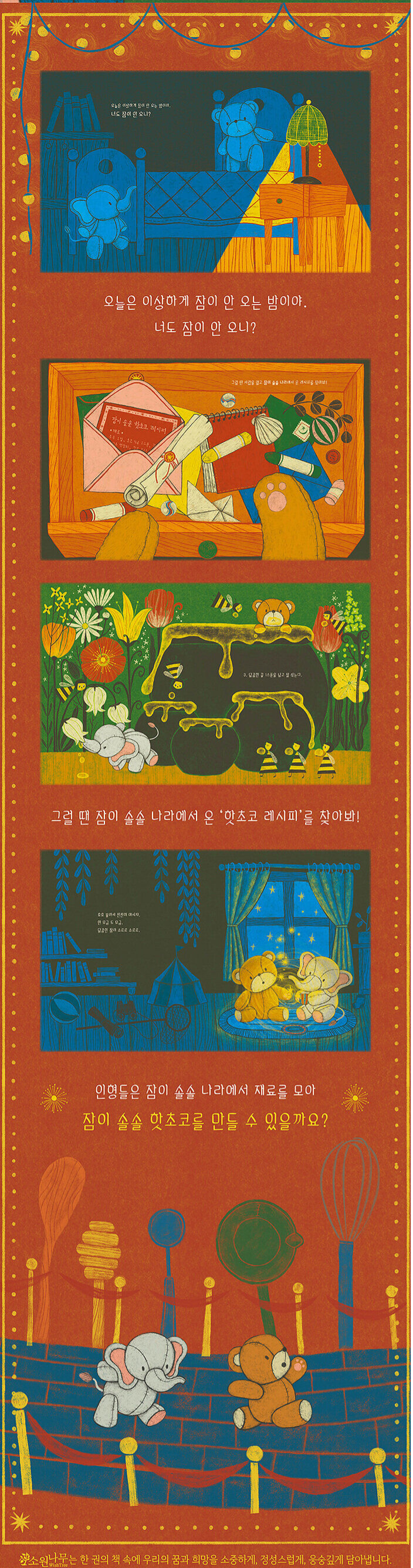 在这个绘本中,你将遇到一群可爱的玩偶们,它们也为了入睡而忙碌。你们将一起前往"催眠之国",寻找制作热巧克力所需的特殊材料。当你们到达目的地后,你们将在马克杯中倒入香浓牛奶、巧克力粉和甜蜜的蜂蜜,还有闪耀的睡眠碎片。伴随着催眠曲的轻声哼唱和搅拌,一杯诱人的热巧克力就准备好了!