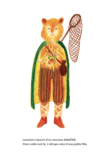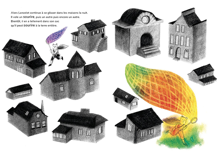 于是,Lancelot继续在夜晚里悄悄进入房屋。他偷走一个微笑,然后又一个,再然后是另一个。很快,他的袋子里装满了很多微笑,他可以对整个世界微笑了。