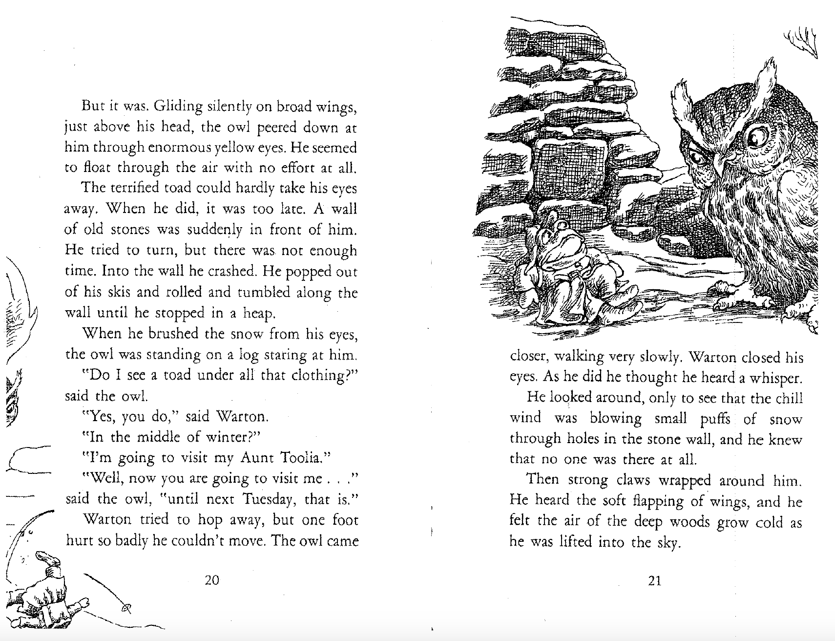初時,一切都進展順利,然而沃頓最終被一隻懷有敵意、孤獨的貓頭鷹抓獲。這只貓頭鷹告訴沃頓,他的生日就在下一個星期二,而沃頓將成為他的晚餐,故事由此得名《星期二的蟾蜍》。然而,隨著時間的推移,一個不同尋常的關係在貓頭鷹和沃頓之間萌芽了。沃頓在等待他的命運時,與貓頭鷹之間漸漸建立起一種特殊的紐帶。