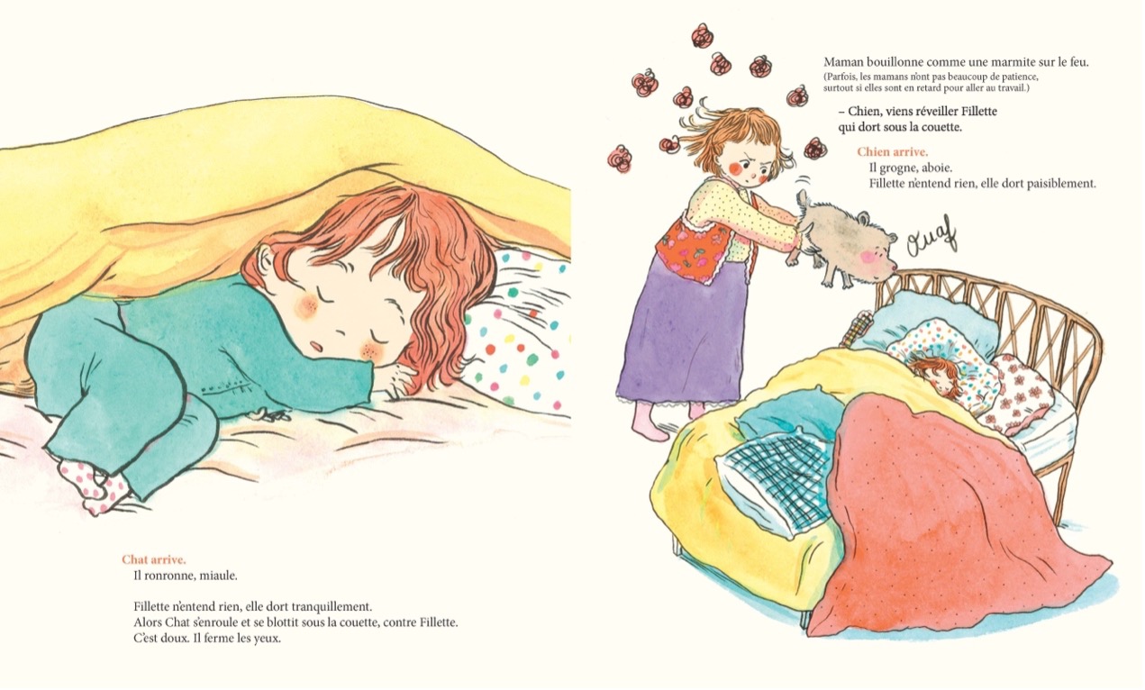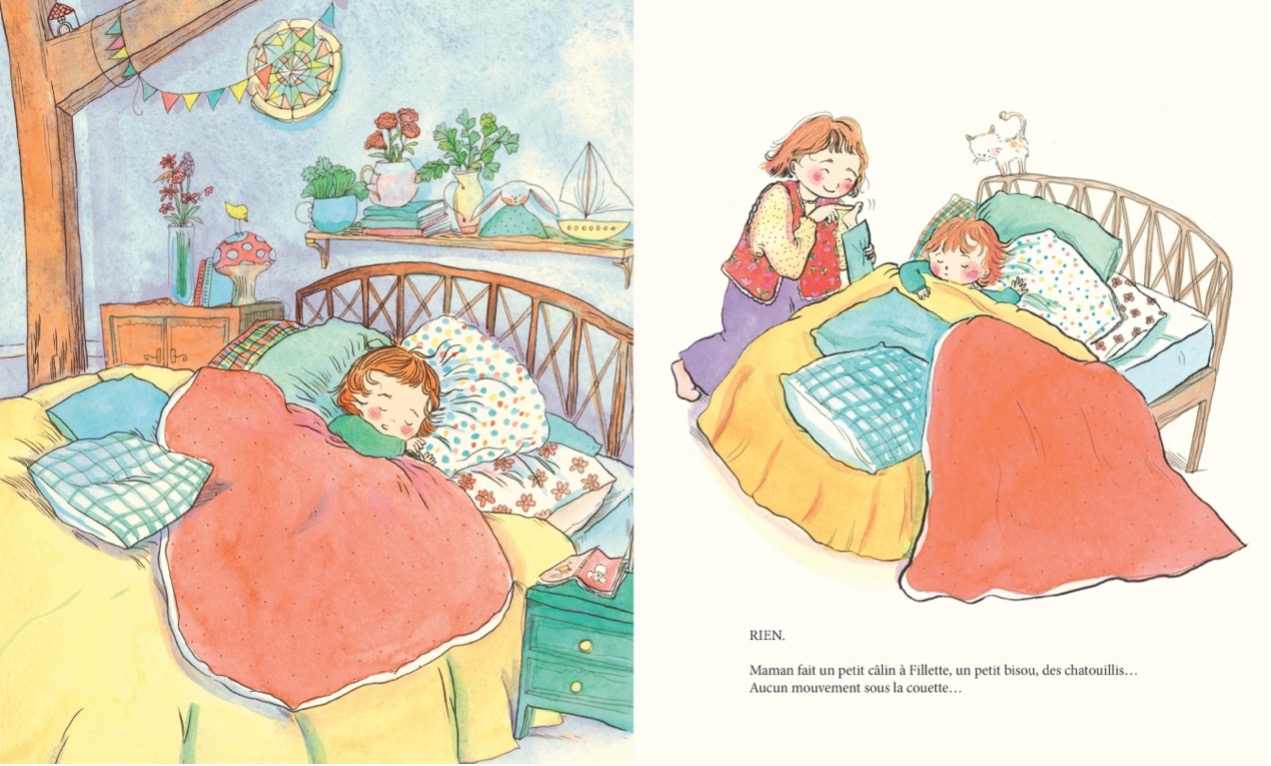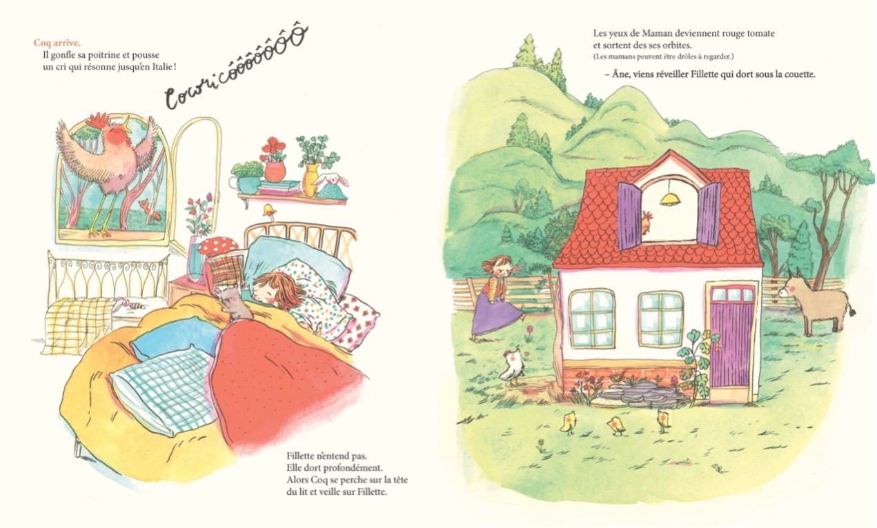 - Maurèen Poignonec的插画为故事创造了一个温馨的山居环境。她巧妙地表现了角色的表情,从一个快乐地打呼噜的可爱小女孩到可爱而古怪的动物!