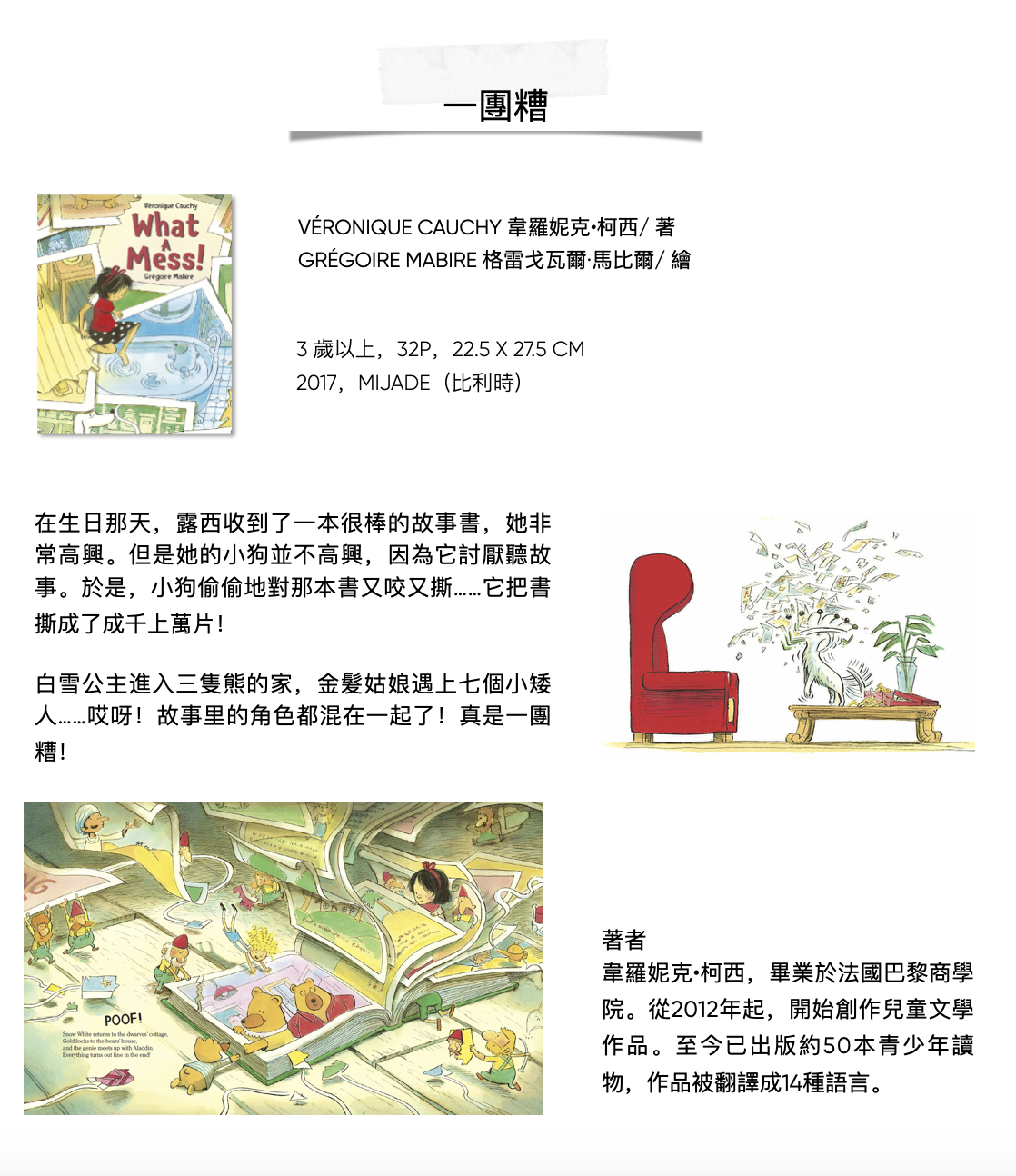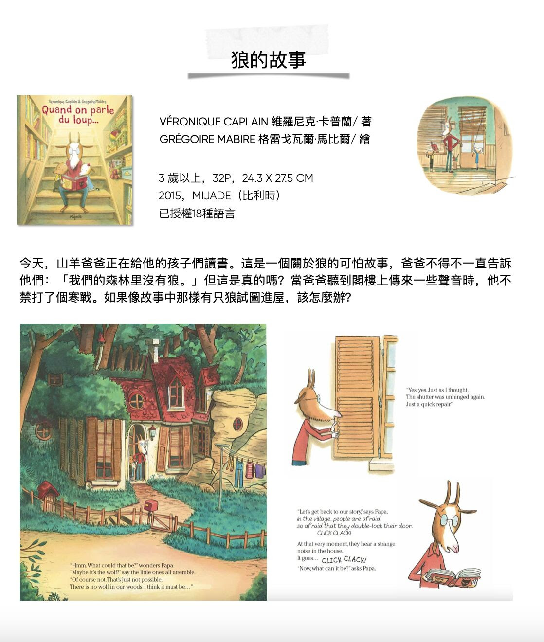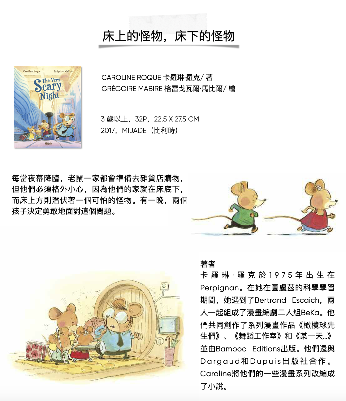 GrégoireMabire 1975年出生在法國的聖洛,目前居住在南特。他在烹飪方面取得了學位,後來轉向繪畫,並在布魯塞爾的聖盧克學院(Institut Saint-Luc)繼續深造。他在Mijade出版社出版了許多圖畫書,其中包括著名的《書里掉下來一隻狼》被翻譯成29種語言。他還為青少年雜誌(Fleurus)和漫畫(Bamboo)工作。