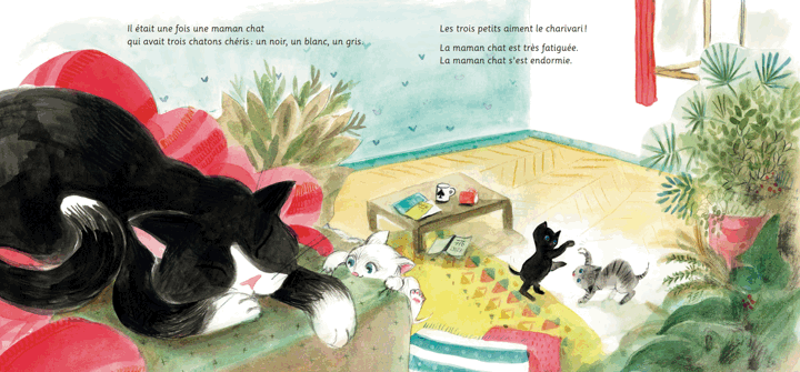喵,喵,喵,小猫们喵喵叫,想唤醒它们的猫妈妈。猫妈妈睁开一只眼睛说:– 你们是谁?你们不是我的三个心肝宝贝,黑的,白的,灰的。走开!离开这里!