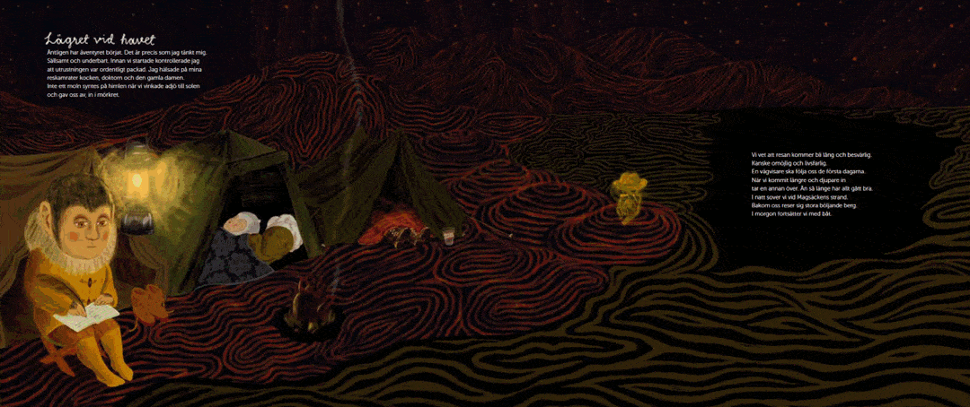 ”穿越身体的迷人之旅,与众不同”——Barnens boktips (26/10) “[...] 旅行者们已经进入了人体,并目睹了那里隐藏的奇迹。 他们步行、骑马和乘船旅行。 有时他们在肺部附近露营,欣赏美丽之处,或者在狭窄的肌肉山中骑马奋斗。 作家Tuvalisa Rangström创作了一篇充满感官和诗意的文本,是对插画家的一份巨大馈赠。[...] Klara Bartilsson首次亮相为图画书插画家。 她的图像在美丽的图案和颜色中散发出美丽、温暖和想象力。 她在陡峭的山坡和狂风中为身体的内部赋予生命。 血红色的颜色与旅行者形成鲜明对比,构成了一场不可思议的冒险!整体评分:5”——(Wedenmark, BTJ-häfte 21)