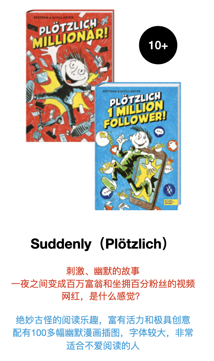 “我儿子很喜欢这本书。他在8岁的时候读了它。说服他读书真的不容易,但这本书做到了!它巧妙地结合了刺激、幽默以及作为百万富翁生活中的“黑暗面”... 太吸引人了,甚至我儿子都舍不得把它放下。与此同时,我们也读了《Plötzlich 1 Million Followers》,这也是一个真正的热门作品!而且它还延续了第一部故事。我们原本并没有期待到这一点,在最后我们的兴奋甚至超出了最初的预期。我儿子非常喜欢这些故事,以至于现在只喜欢读鲁迪格·贝特拉姆的书了... 希望还会有更多的作品问世...两本书都百分之百推荐购买。”