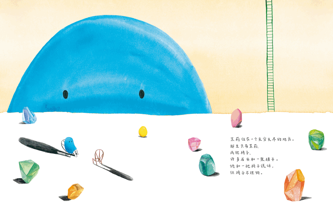 茉莉住在一个无穷无尽的地方,那里只有茉莉,两把椅子,许多石头和一架梯子。茉莉很孤单……他很想找一个朋友。于是他去拜访其他住在石头里的孩子。
