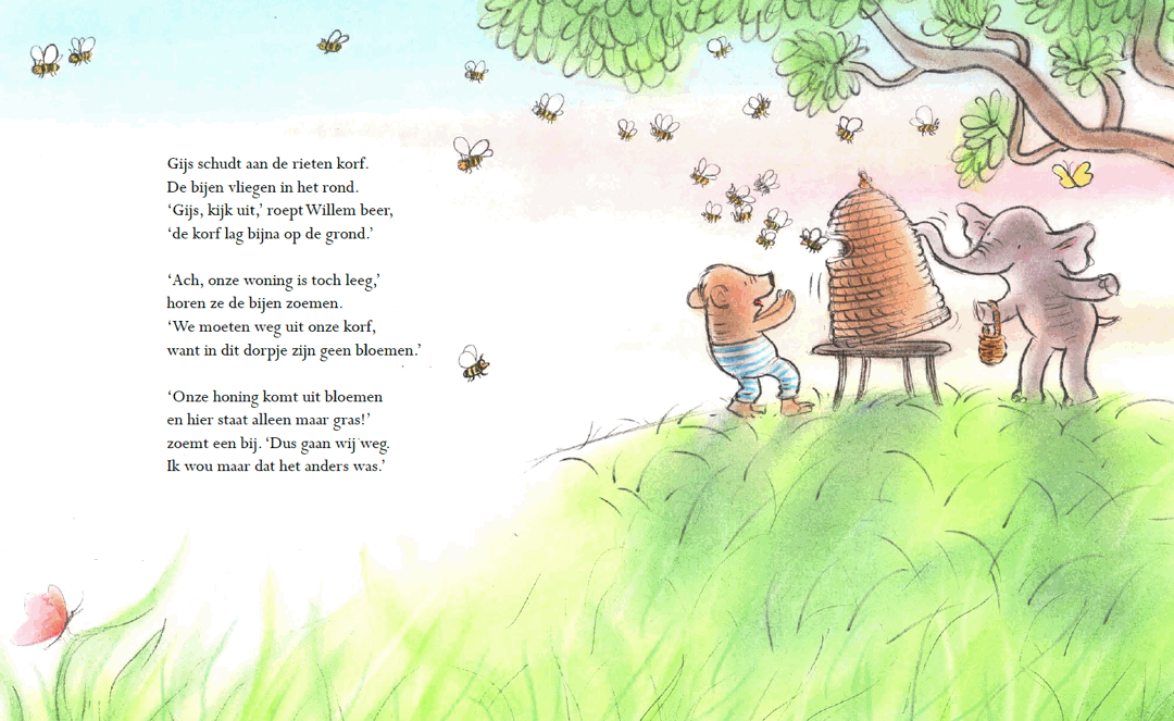 吉斯是一只小灰象,他想要吃一些甜蜜的蜂蜜,但蜂巢是空的!蜜蜂缺少足够的花朵。吉斯很愿意帮助蜜蜂,但要如何做呢?幸运的是,绵羊斯汀蒂知道如何解决这个问题。当动物村庄充满盛开的花朵时,蜜蜂就会回来了。