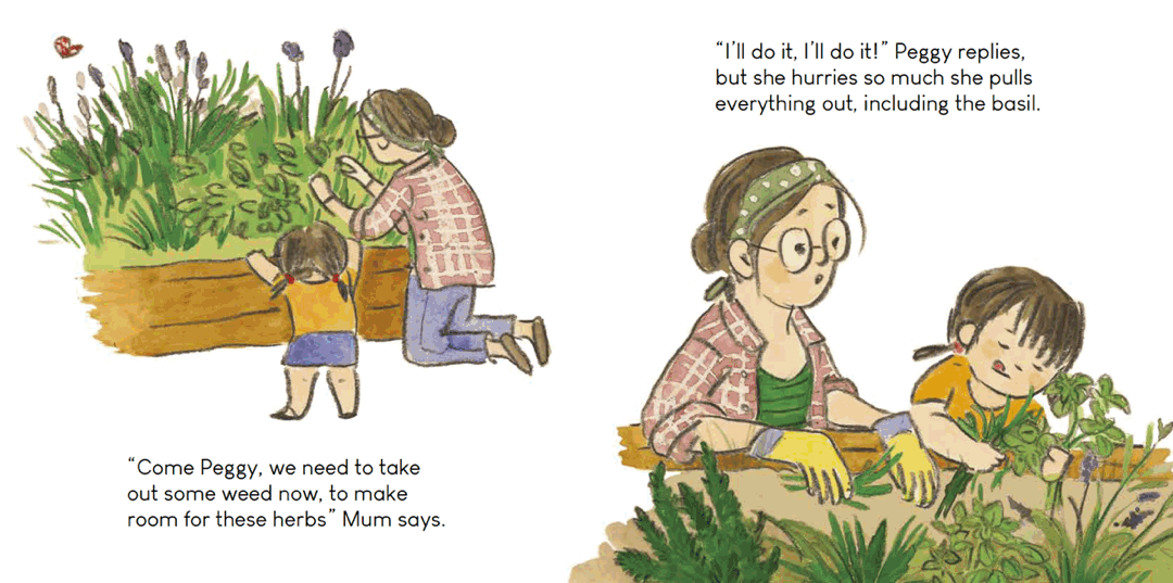 今天,佩吉和她的妈妈去花园照顾植物。佩吉下定决心要帮助妈妈完成所有的工作:种豆子、给幼苗浇水、除去杂草、品尝覆盆子……"我来做,我来做!"她每次都大喊着。