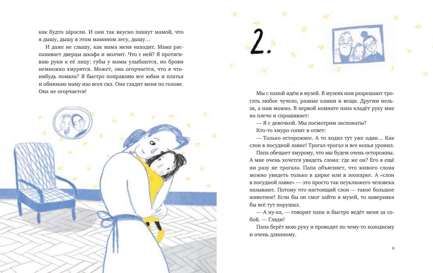 即使一个孩子看不见,他/她仍然能够认识这个世界、感受幸福,并与家人和朋友分享情感。女主角喜欢玩乐和与人沟通。我们从未直接被告知女孩是盲人。她如此活跃和快乐,以至于很难想象她没有过着充实的生活。我们跟随她的想法、梦想和生活事件,有机会从不同的角度审视自己的生活。这本图文并茂的书分为四大部分,每个部分都有独特的主题和颜色。我们了解女孩与大象的友谊:无论是博物馆中的大象还是天空中象形云朵。我们也跟随她与拥有第三条腿的爷爷“巴斯勒”展开冒险;她学会写作和阅读,像特工一样使用自己的秘密代码。最后,她结识新朋友,尽管人们并不总是开放地接纳那些不理解的事物。