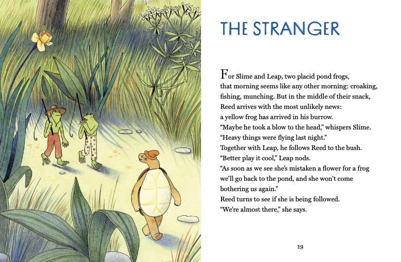 在城市的边缘,有一个比以往任何时候都更加生机勃勃的迷人小山谷——绿荫谷,它是许多动物的家。故事开始于一个强风席卷的日子,一只名叫Giunco的害羞乌龟和其他动物都在准备迎接即将到来的暴风雨。然而,一只从未见过的黄色青蛙突然被风卷到了绿荫谷。它没有名字,也不知道家是什么。它从一个远离自然的玻璃箱中来到了这个充满生命的新世界。 但是在绿荫谷中,没有人是孤独的:在它的新朋友的帮助下,即使是迷失的青蛙也能找到自己!在许多动物朋友的陪伴下,它经历了许多第一次:第一次看到天空、第一次感受到风、第一次听到音乐。这只青蛙对自己的身份和归属感到好奇和困惑。在一系列的探索和重重挑战之后,青蛙终于获得了自己的名字——标志着它正式成为绿荫谷的一员,标志着它的新生和自我认同。